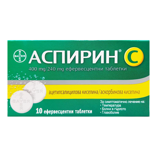 Таблетки шипучие (для приготовления раствора д/приема внутрь) – 1 таблетка содержит 400мг Ацетилсалициловой кислоты (Аспирин) + 240мг Аскорбиновой кислоты (Витамина С).