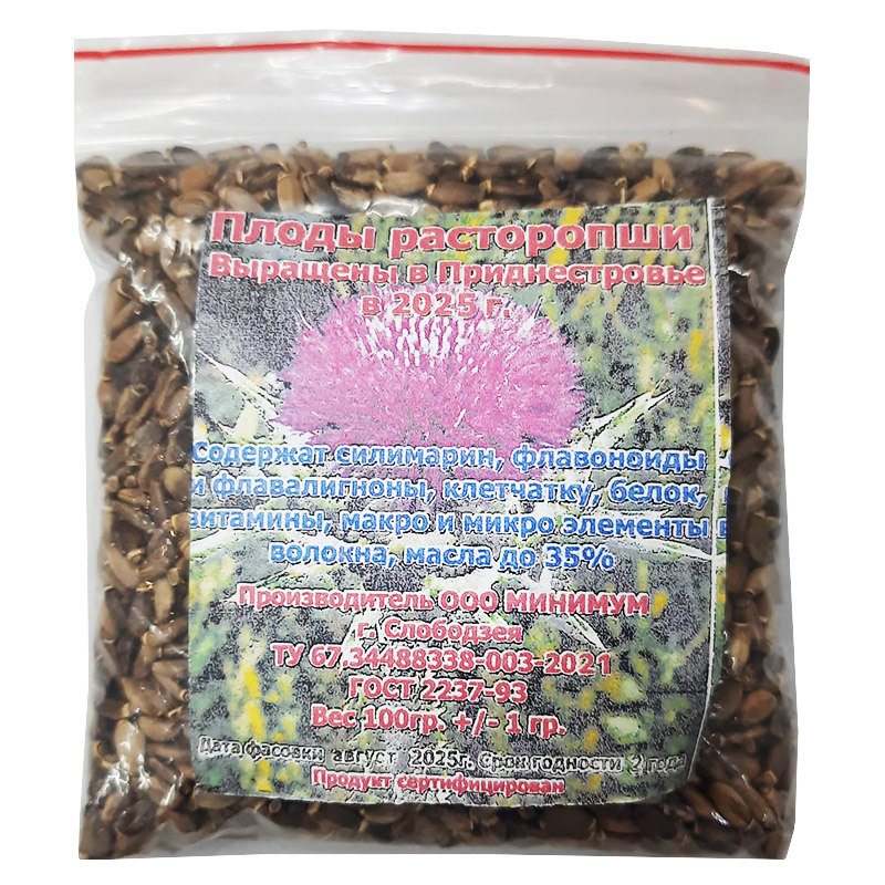 *Плоды расторопши — растительное сырье расфасовано общим весом (россыпью) от 100г и упаковано в пакет (пакетик) целлофановый - пачка картонная или в полимерный пакет; используют для измельчения и добавления в пищу, приготовления фиточаев.