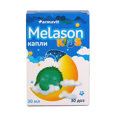 МЕЛАСОН КИДС капли для приема внутрь – специально разработанная для детей биологически активная пищевая добавка, содержащая оптимальную комбинацию Мелатонин + Растительные экстракты, которые улучшают качество сна и ускоряют процесс засыпания. Мелатонин – гормон сна, способствует сокращению времени, необходимого для нормального засыпания. Мелиссы листьев экстракт способствует поддержанию нормального эмоционального равновесия; уменьшению спазмов в кишечнике (при повышенном газообразовании). Ромашки цветков экстракт способствует улучшению процесса пищеварения и защищает слизистую оболочку желудка. Фенхеля плодов экстракт способствует уменьшению вздутия и ассоциированных с ним спазмов; поддерживает нормальную микрофлору кишечника. Продукт облегчает процесс засыпания, снижает повышенную активность, мешающую спокойному и глубокому сну. Важно!_Рекомендуется консультация лечащего врача. Необходимо внимательно прочитать Инструкцию перед применением. Применять БАД - согласно показаниям, способу применения и в дозах, указанных в Инструкции по применению продукта, если нет иных назначений врача. Информацию о приеме можно уточнить у фармацевта.