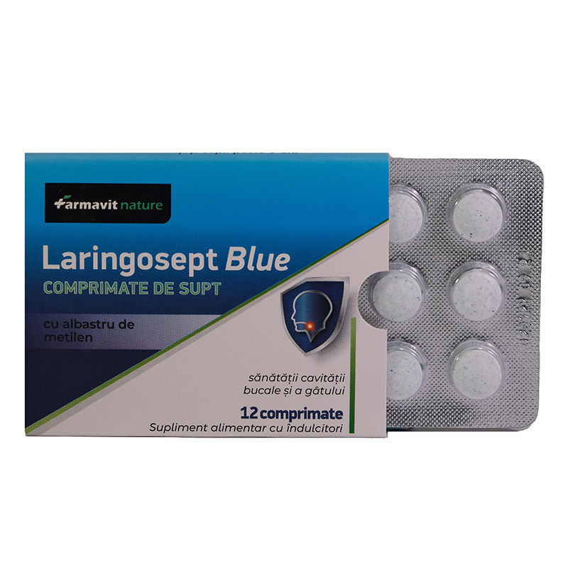 ЛАРИНГОСЕПТ БЛУ таблетки с метиленовым синим (Метиленовый синий + Эфирные масла эвкалипта, Лимона, Мяты, Тимьяна + Витамины В1, В5, В6 + Цинк) – уникальная комбинация антисептиков, антиоксидантов, биологически активных веществ, содержащихся в эфирных маслах, и витаминов группы В, которые комплексно действуют при воспалении ротовой полости и горла. Продукт не является лекарственным средством. Комбинация компонентов ЛАРИНГОСЕПТ БЛУ оказывает влияние на грамположительные и грамотрицательные микроорганизмы, обладает местным антисептическим и противовоспалительным действием. Эффективность продукта обусловлена свойствами активных веществ: Метиленовый синий – обладает сильным антисептическим, бактериостатическим эффектом благодаря взаимодействию с мукополисахаридами и белками микроорганизмов; Эвкалипта эфирное масло – природный антисептик, снимает воспаление и боль в горле; Лимона эфирное масло – обладает обезболивающим действием; Мяты эфирное масло – природный антисептик, источник биологически активных веществ, обладающих мощным действием против патогенных микроорганизмов, оказывает местное антисептическое действие, улучшает кровообращение и обладает охлаждающим (отвлекающим) действием на рецепторы слизистой горла; Тимьяна эфирное масло – улучшает трофику тканей (циркуляцию крови, насыщение кислородом), обладает антисептическим, антибактериальным действием; Цинк – антиоксидант, способствует повышению сопротивляемости организма инфекциям; Витамины группы В (В1, В5, В6) – участвуют в формировании эритроцитов и нормальному функционированию иммунитета. Важно!_Рекомендуется консультация врача; необходимо внимательно прочитать Инструкцию перед применением. Применять средство - согласно показаниям, способу применения и в дозах, указанных в Инструкции по применению средства, если нет иных назначений врача. Информацию о приеме можно уточнить у фармацевта.