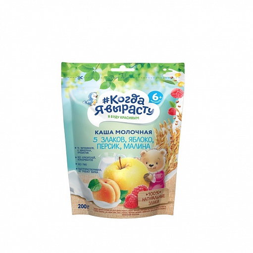 Каша молочная "Когда я вырасту" 5 злаков яблоко-малина-персик 6 мес. 200г (б/с (2026-05))
