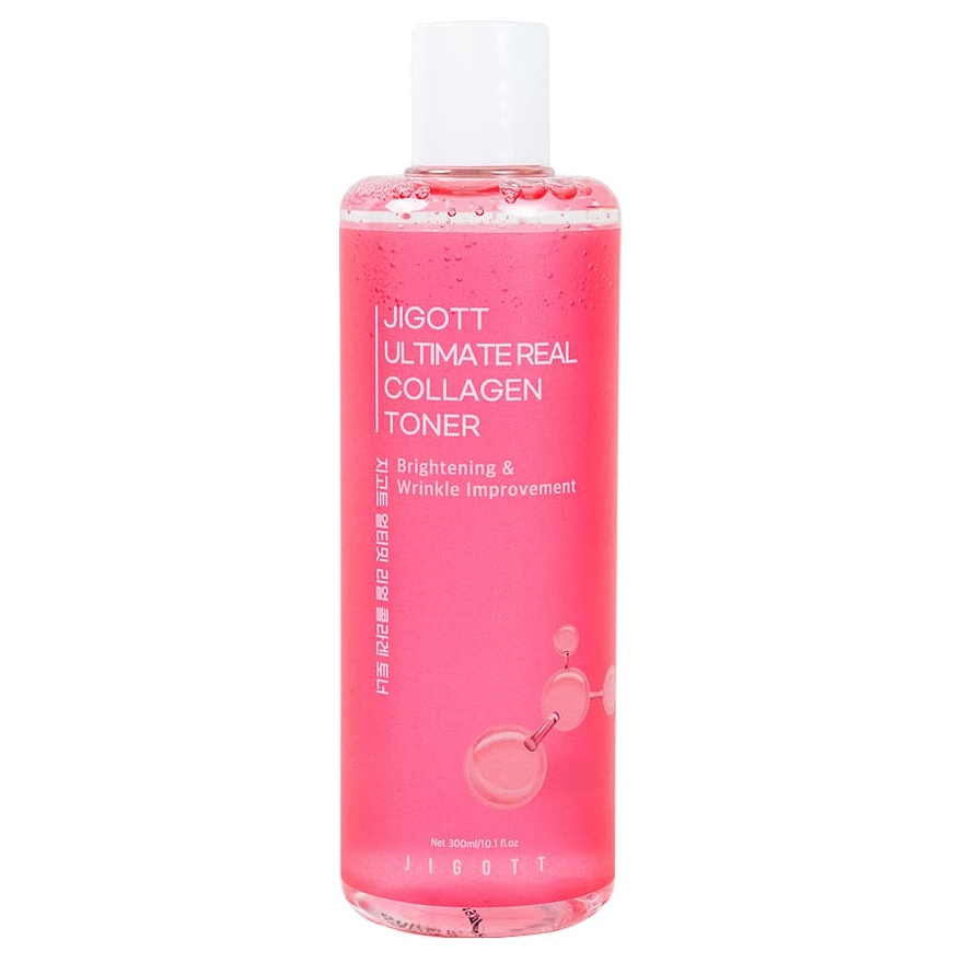 Тонер для лица Ultimate Real Collagen Toner от бренда Jigott поможет сохранить упругость и гладкость зрелой, увядающей, усталой коже. В его состав включен биодоступный гидролизованный коллаген, который: