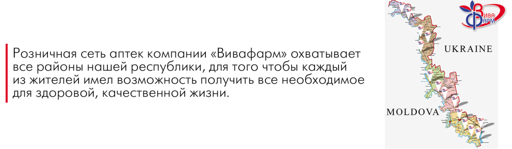 В настоящее время аптечная сеть компании «Вивафарм» — это более 50 аптек и фармацевтических пунктов, которые расположены по всей Приднестровской Молдавской Республике и популярны благодаря широкому ассортименту, высокому уровню обслуживания и умеренным ценам.